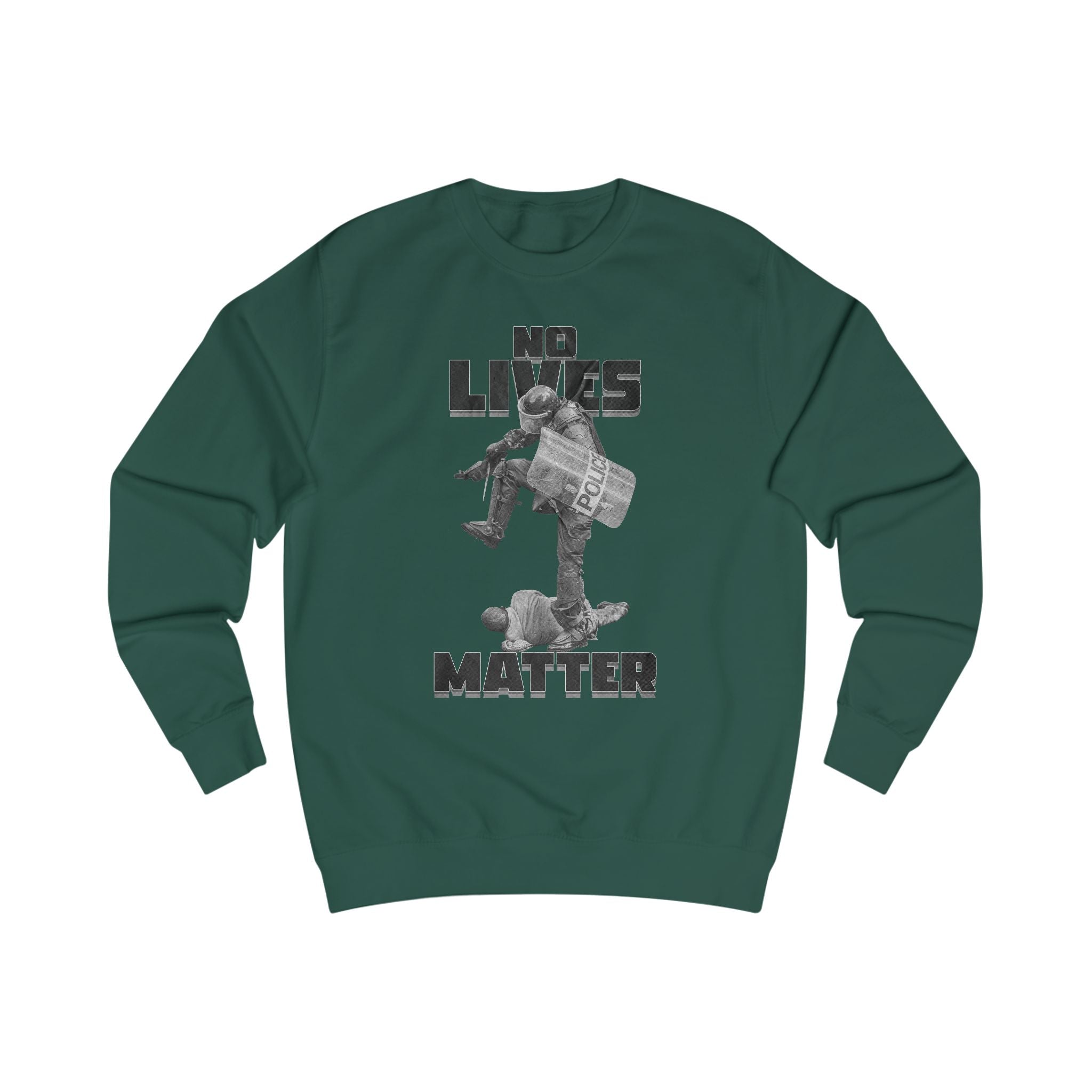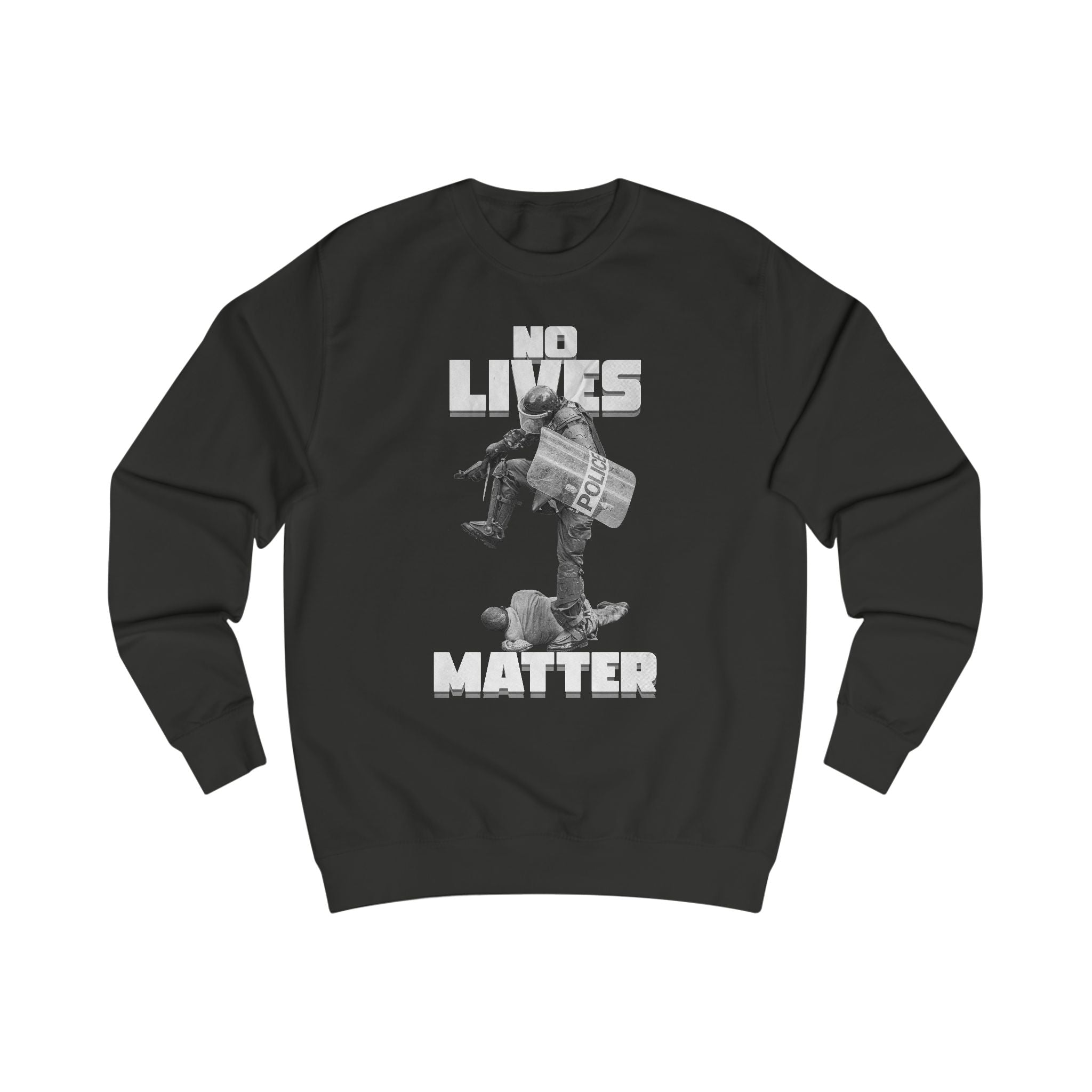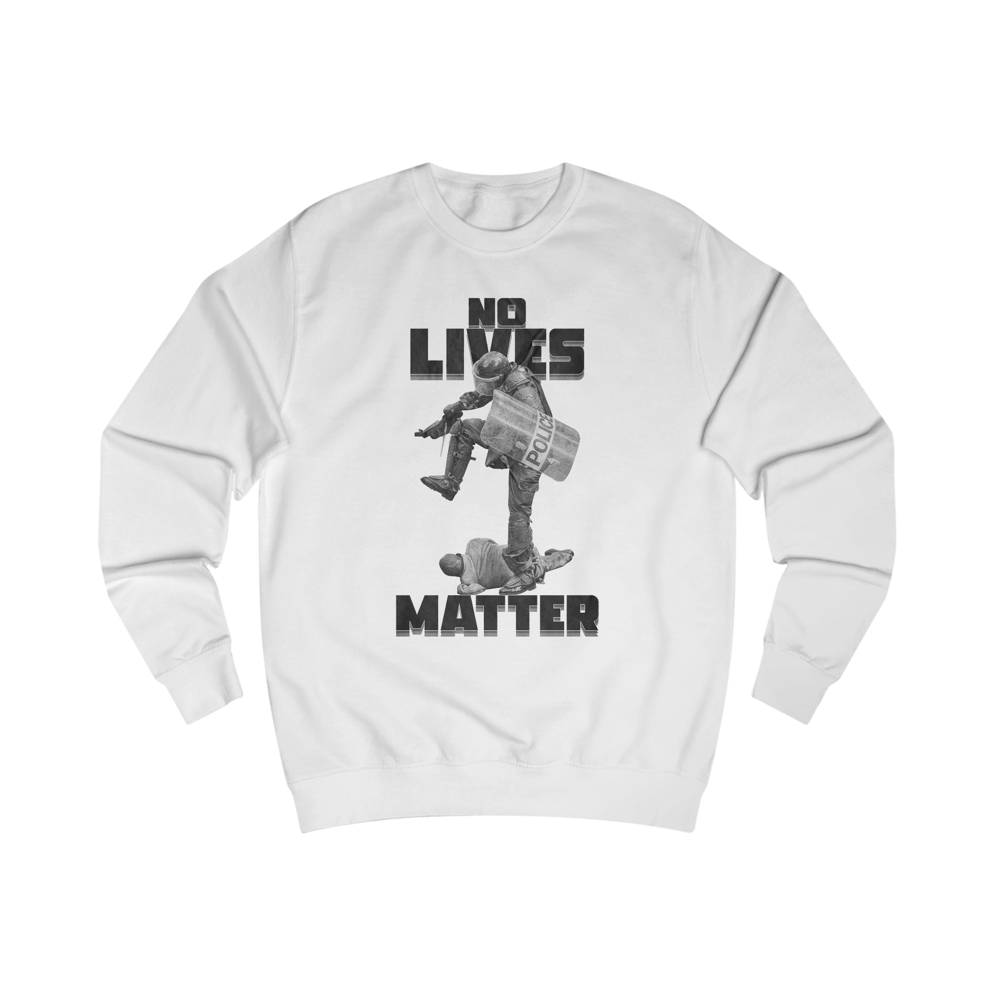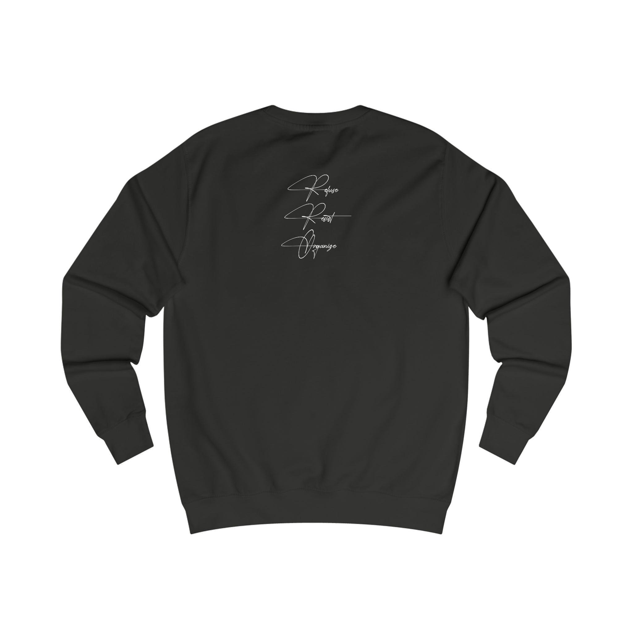 This sweatshirt carries a stark, confrontational message built into a gritty, collage-style graphic. Heavy, monochrome art across the front shows an armored figure stepping on another person beneath bold, condensed type. The back has a small, handwritten-style script near the neck for a quieter signature detail. Wear it when you want your clothes to make a raw statement—layered over a tee or under a coat, it sits comfortably through long days thanks to substantial medium-heavy fabric and structured seams. The fit is roomy but shaped, with ribbed cuffs and collar that hold form after repeated wear. It feels weighty and grounded, designed for someone who wears conviction as plainly as they wear their clothes.