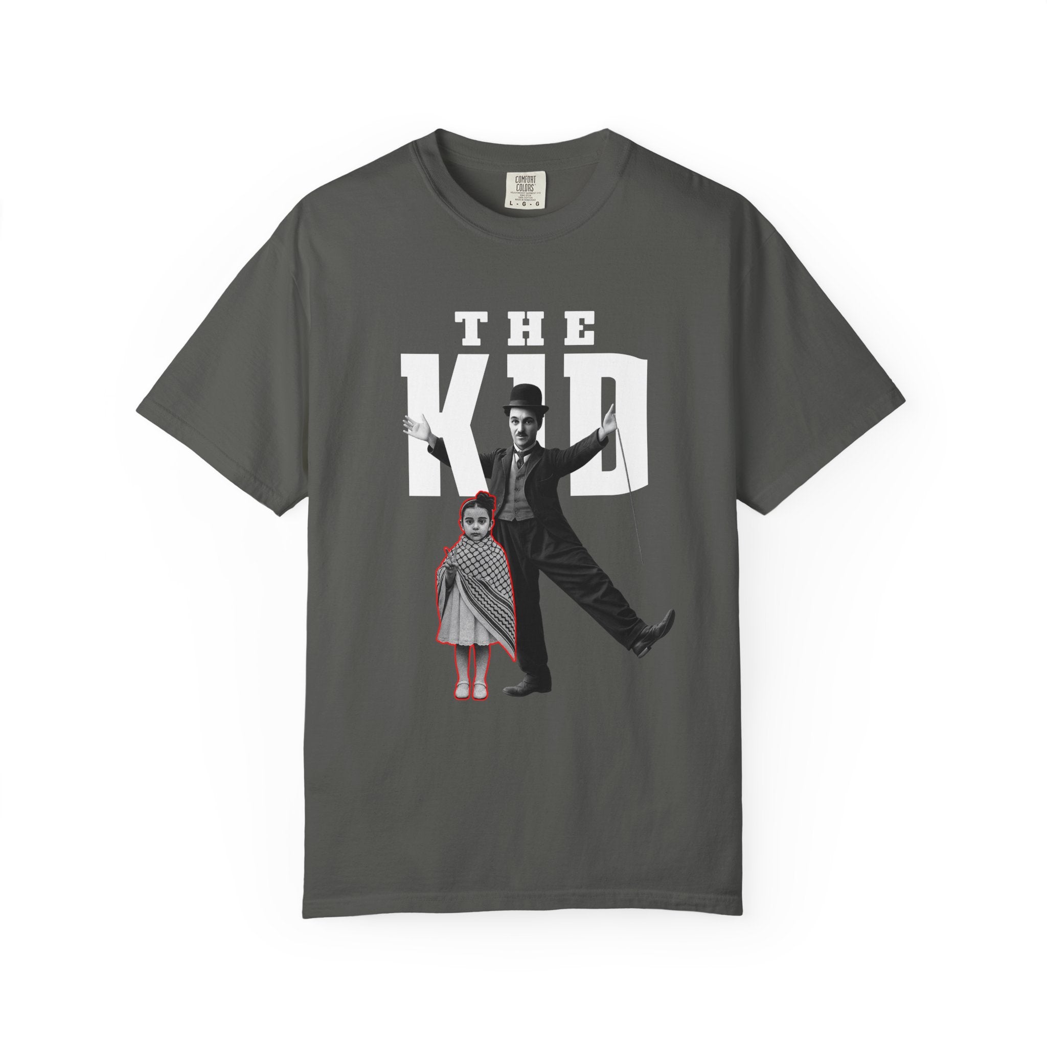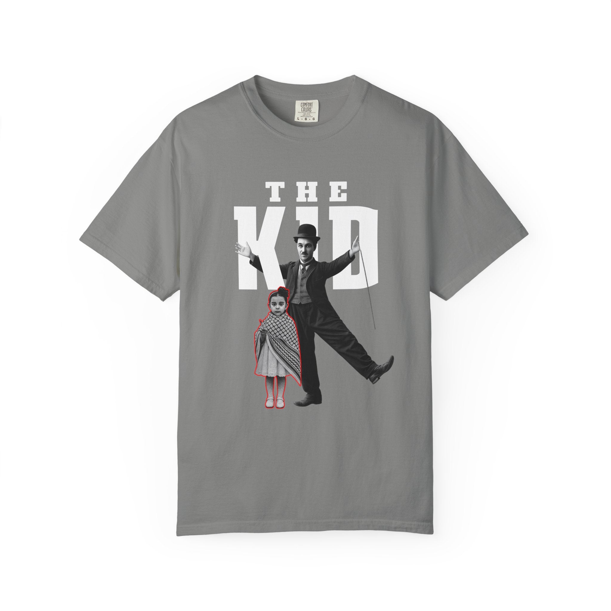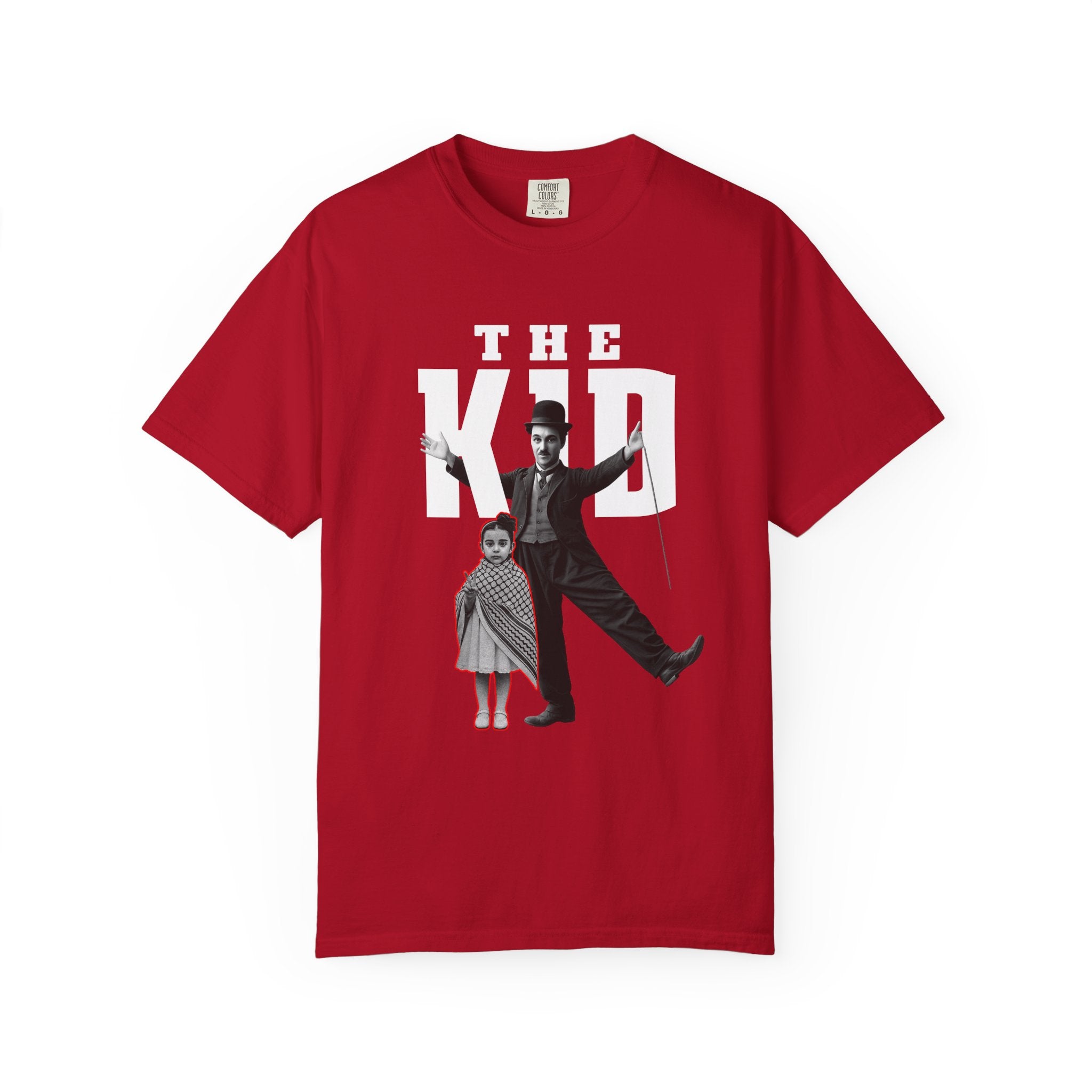 A heavyweight garment-dyed tee with a vintage-cult aesthetic. The front shows a bold, poster-style graphic of a silent-era entertainer and a small child beneath large block letters reading "THE KID," while the back carries a delicate red script detail down the spine. The dyed, pre-shrunk 100% ring-spun cotton softens with wear, giving each shirt a broken-in, lived-in look. With a relaxed fit and tubular construction, this tee hangs cleanly and resists twisting, making it an easy layering piece for relaxed streetwear or nostalgic wardrobes. The sewn-in label and double-needle stitching add durability so the graphic stays grounded through repeated wash-and-wear cycles.