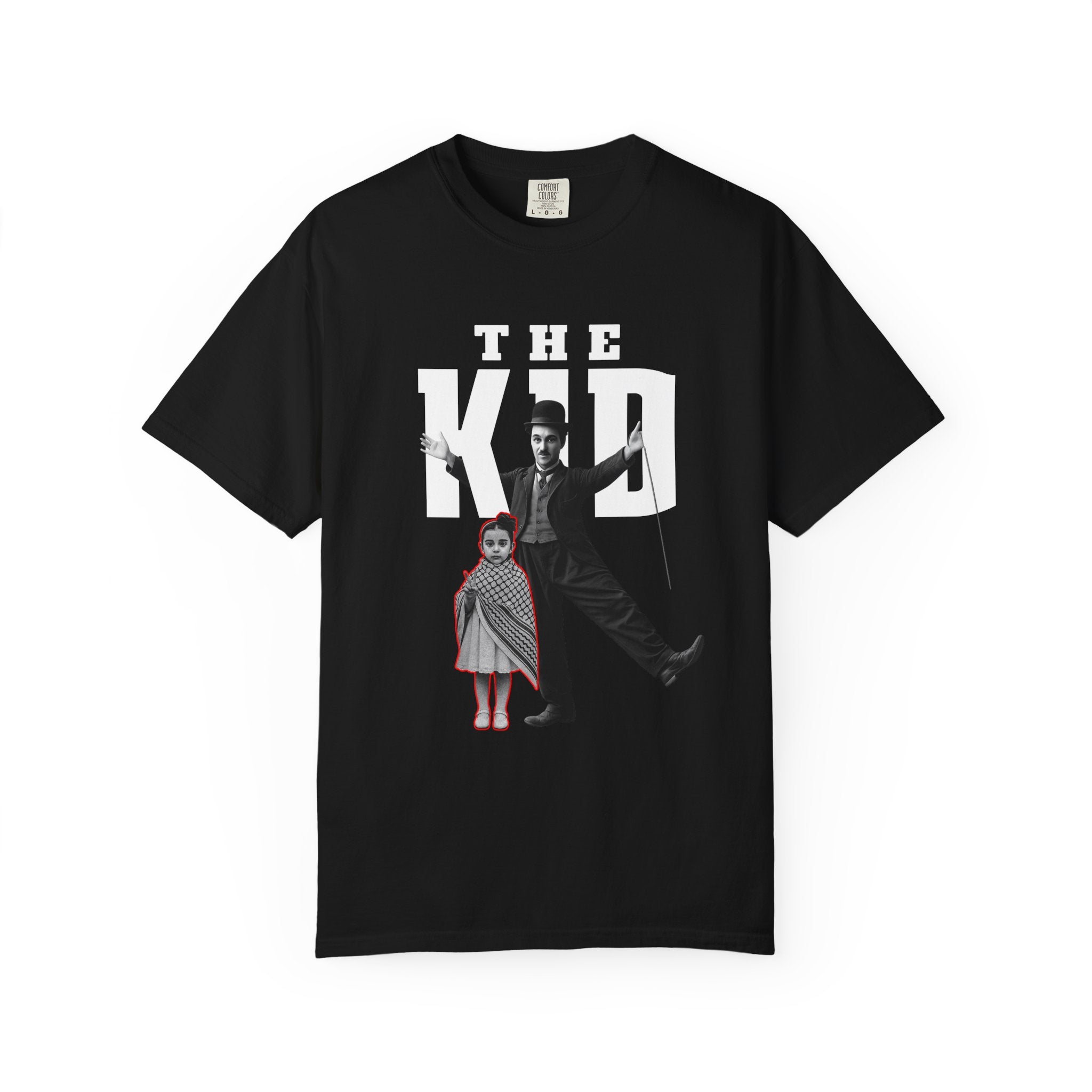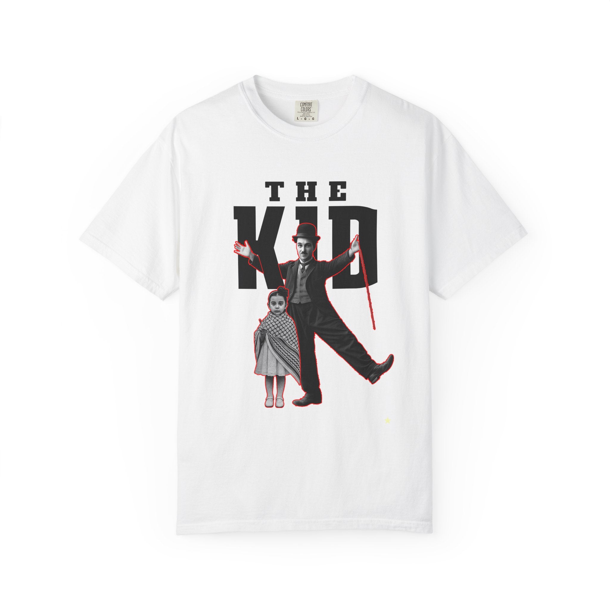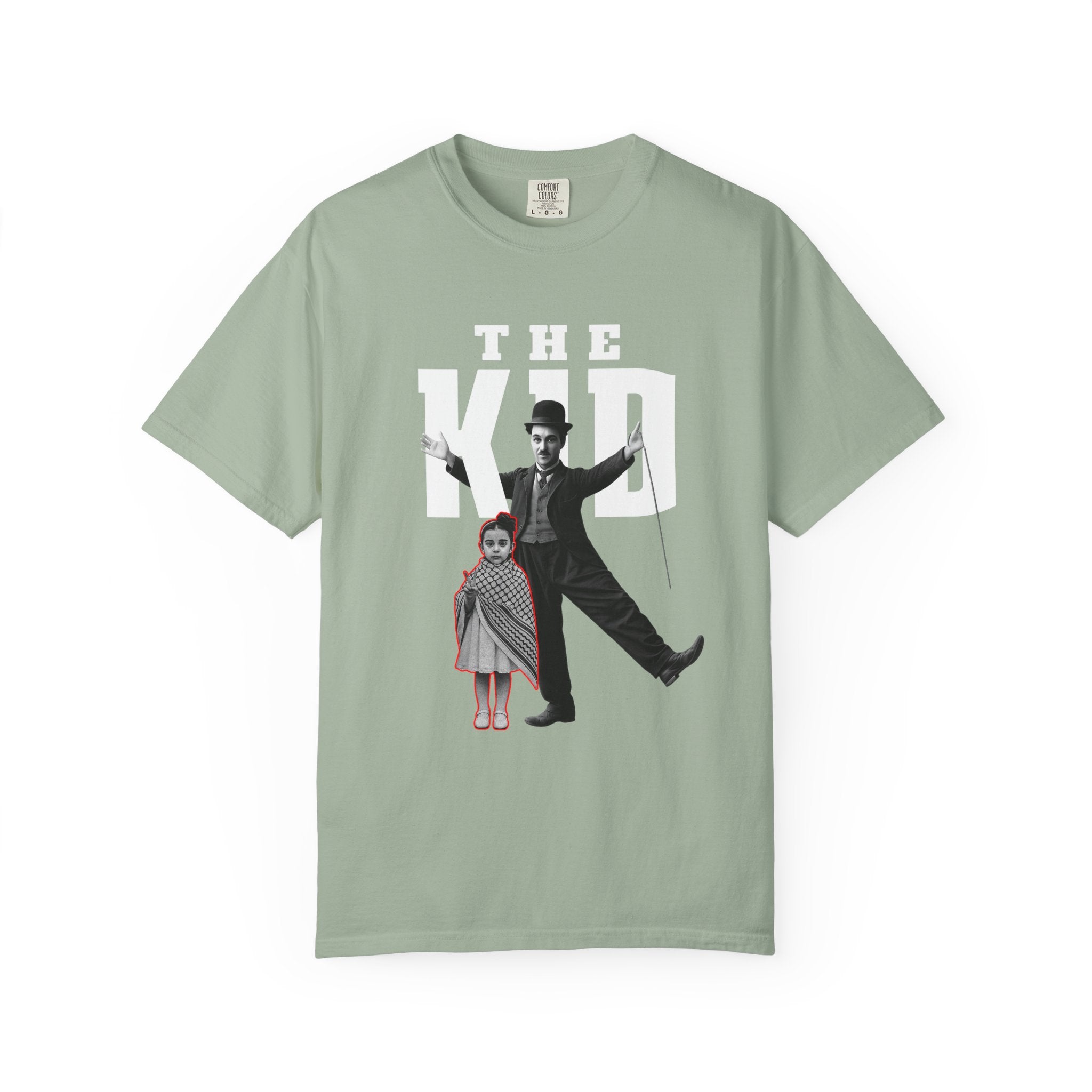 A heavyweight garment-dyed tee with a vintage-cult aesthetic. The front shows a bold, poster-style graphic of a silent-era entertainer and a small child beneath large block letters reading "THE KID," while the back carries a delicate red script detail down the spine. The dyed, pre-shrunk 100% ring-spun cotton softens with wear, giving each shirt a broken-in, lived-in look. With a relaxed fit and tubular construction, this tee hangs cleanly and resists twisting, making it an easy layering piece for relaxed streetwear or nostalgic wardrobes. The sewn-in label and double-needle stitching add durability so the graphic stays grounded through repeated wash-and-wear cycles.