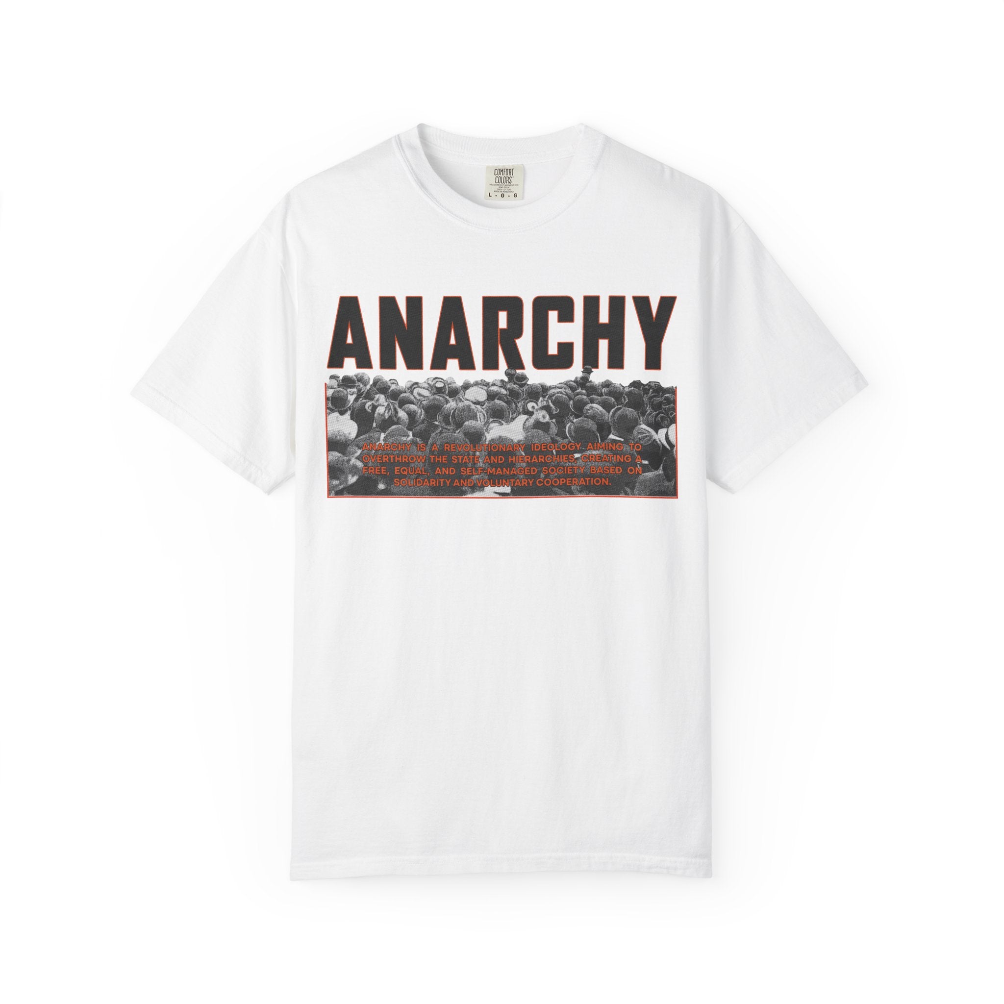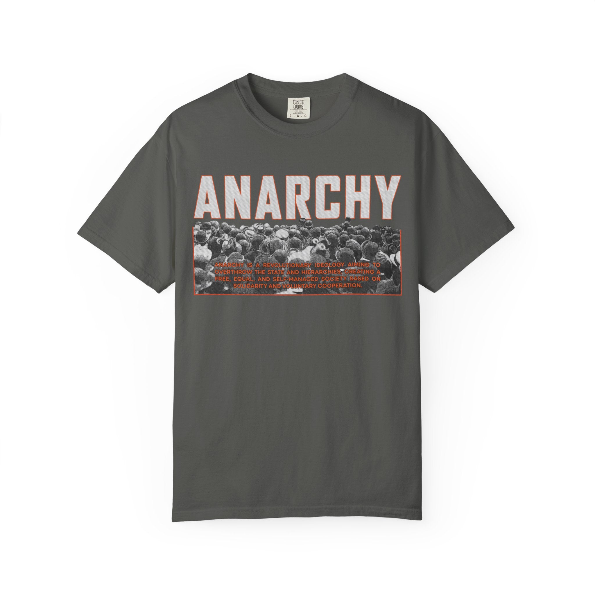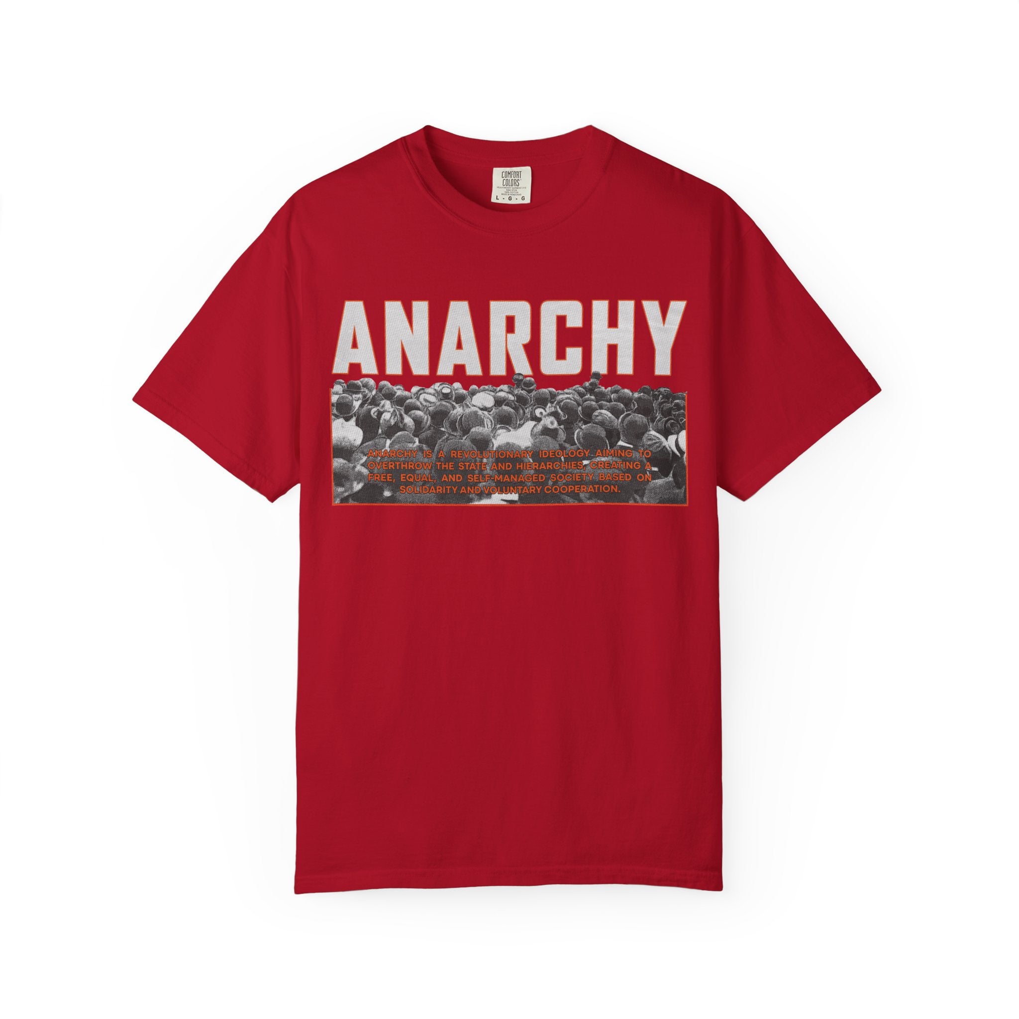 This heavyweight, garment-dyed tee carries a raw, rebellious edge while staying comfortably wearable. Bold “ANARCHY” lettering sits above a gritty black-and-white crowd photo with subtle rust-toned accents — a look that speaks to street protest, DIY music nights, and late-night conversations about change. Cut in a relaxed silhouette from pre-shrunk, ring-spun cotton, it drapes with lived-in softness right away. Wear it under a denim jacket for shows, pair it with worn-in jeans for city walks, or let it be the quiet statement piece at gatherings where ideas matter more than appearances.