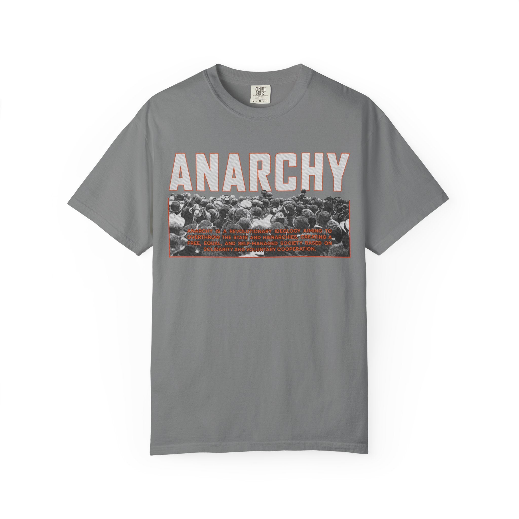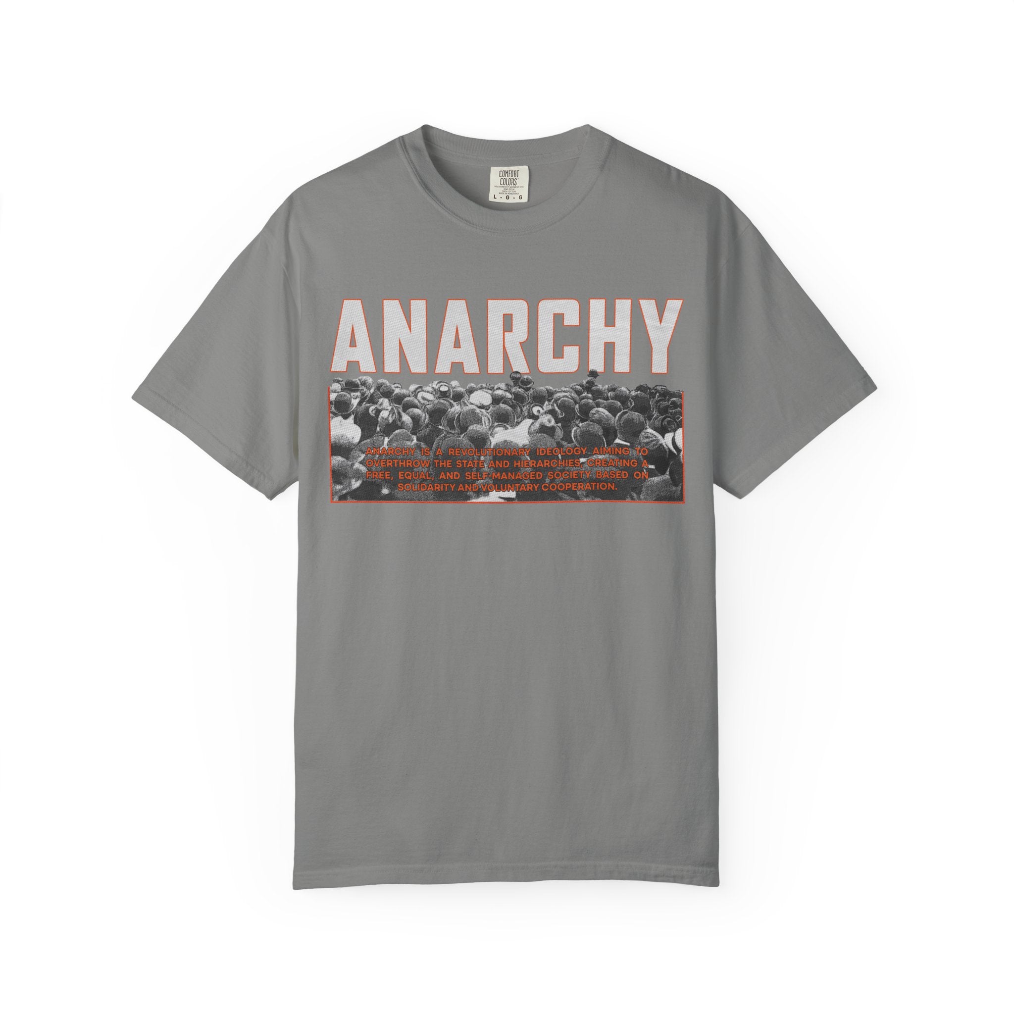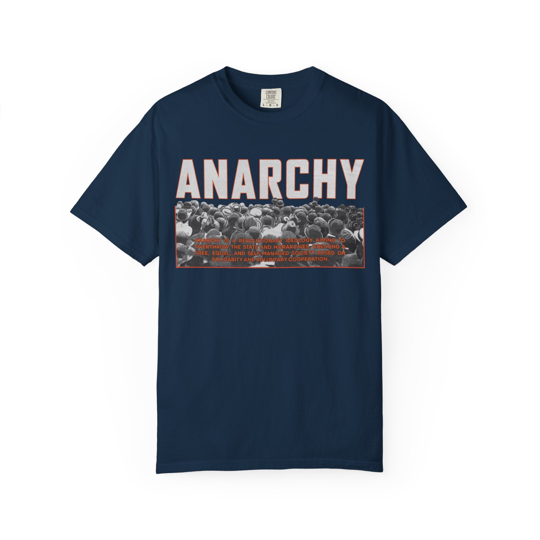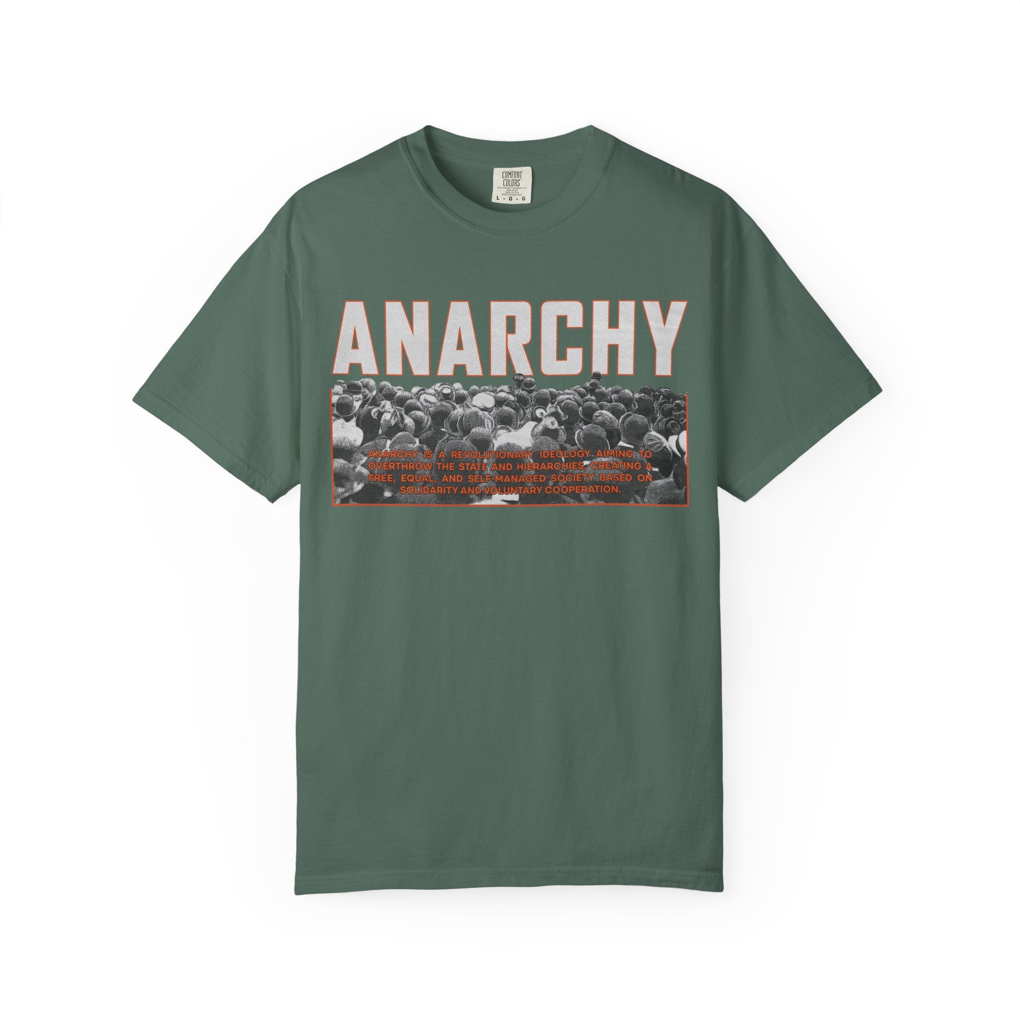 This heavyweight, garment-dyed tee carries a raw, rebellious edge while staying comfortably wearable. Bold “ANARCHY” lettering sits above a gritty black-and-white crowd photo with subtle rust-toned accents — a look that speaks to street protest, DIY music nights, and late-night conversations about change. Cut in a relaxed silhouette from pre-shrunk, ring-spun cotton, it drapes with lived-in softness right away. Wear it under a denim jacket for shows, pair it with worn-in jeans for city walks, or let it be the quiet statement piece at gatherings where ideas matter more than appearances.
